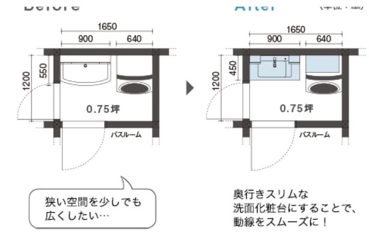 洗面台の幅や、奥行き、高さを変えたり、