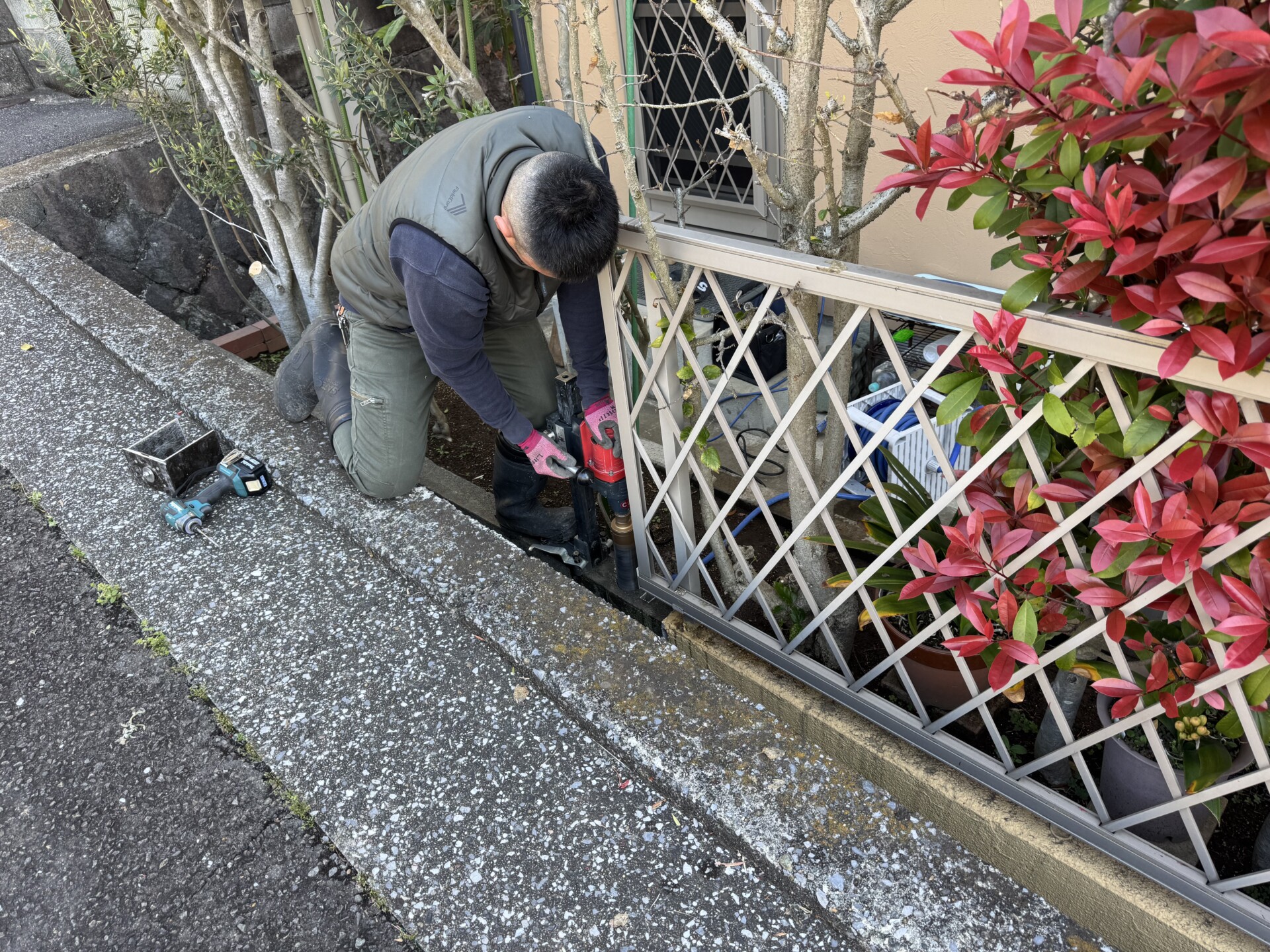 2026.04.02 フェンス交換工事 横須賀市鴨居でフェンス交換工事を行なっています。 もともと古いフェンスが付いていて破損したのが交換のきっかけでした。 一部の交換ですので隣のフェンスに合わせたヒシクロスタイプを設置します。