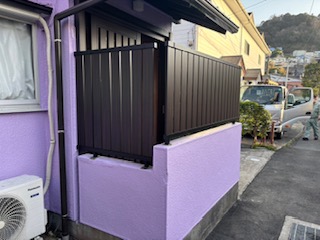 フェンス交換工事 2026.03.13 玄関引戸交換と併せ、フェンスの交換も行わせて頂きました。既存は木製フェンスでしたが、腐らないアルミ製に変更LIXIL フェンスAB TS2型 色クリアダークを 設置しました。