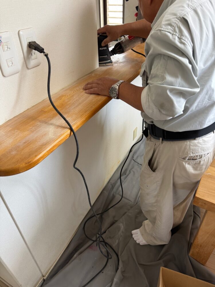 横須賀市野比でキッチン前のカウンター塗装を行なっております。既存のニスをケレンではがし、下処理を行います。