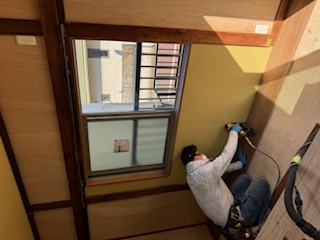 本日はコーキング打ちを行います。まずは密着性を高めるためのプライマー塗りを行っております。