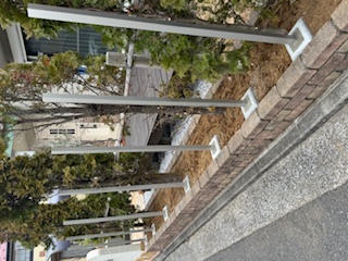 フェンス取付工事 H1400のフェンスを設置しております。 元々フェンスが無いところに設置するので 独立基礎を作って柱を建てています。