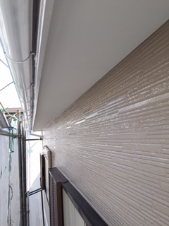外壁中塗り、上塗り完了です。 帯など細部の塗装を行っています。