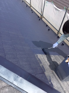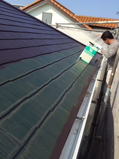 屋根シーラー後の中塗りを行っています。