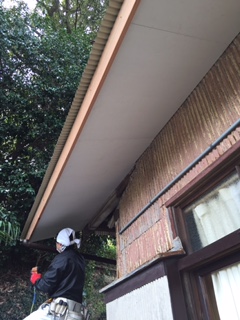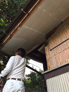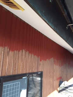 破風軒塗装工事を行っています。 まずはシーラーで密着性を高めます。