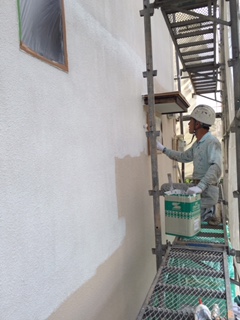 外壁下塗りのフィーラー塗装を行っています。モルタルの細かいヒビをカバーしていきます。