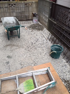 土間コンクリート打ち工事を行っています。 コンクリートを打つ前の下準備を行っています。