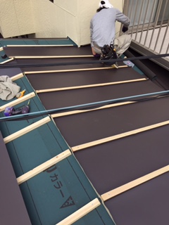 本日も下屋根瓦棒葺き替え工事を行っています。