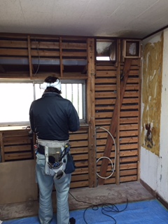 キッチンリフォーム工事着工です。 キッチンを解体し、壁下地工事を行っています。