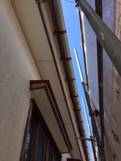 本日は破風、雨樋などブラウンにする部位の塗装を行っています。 しばらく天気が続きそうなので安心です。