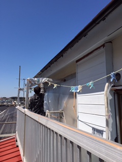 外壁塗装工事、本日はケレン、錆止めなど下地処理を行っています。