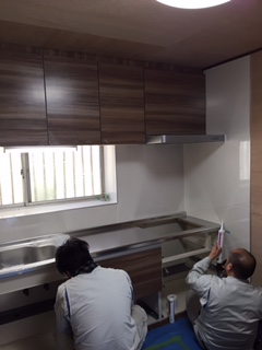 キッチンリフォーム工事本日は壁ベニヤ上貼り工事を行っています。