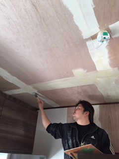 本日はキッチンクロス貼り工事を行っています。まずはパテで下地処理を行っています。 クロスの飯嶋が施工中です。