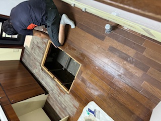 2024.07.16 横須賀市 キッチンリフォーム工事 床フローリングからクッションフロアに変更します。 フローリングの目地をパテで埋めてからクッションフロアを上貼りする工事になります。 住まいのリフォーム ウイル 米山 直輝 TEL0120-44-2719