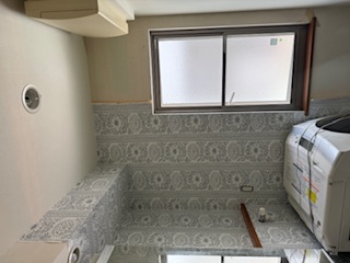 クロス貼り替え工事 本日は洗面所リフォームを行なっていますを 住まいのリフォーム ウイル 米山 直輝 TEL0120-44-2719