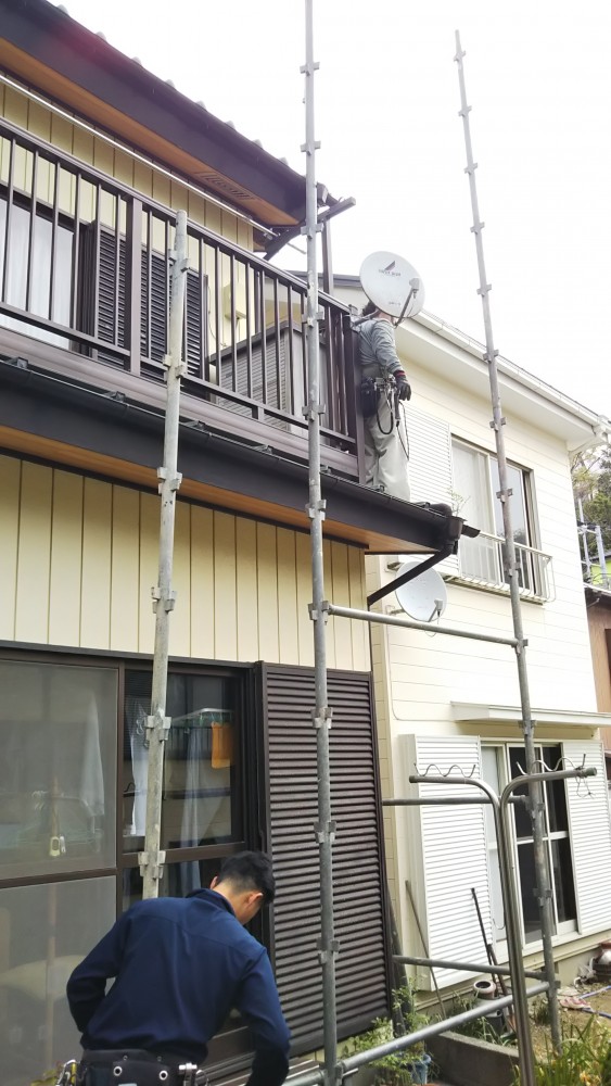 雨樋交換などを行います。まずは足場の組み立てを行っております。