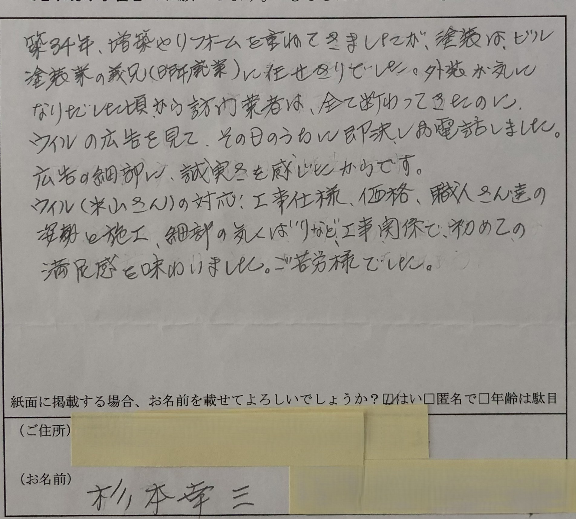 築34年、増築やリフォームを重ねてきまたが、塗装はビル塗装業の義兄(昨年廃業)に任せきりでした。外装が気になりだした頃から訪問業者は全て断ってきたのにウイルの広告を見て、その日のうちに即決し、お電話しました。
