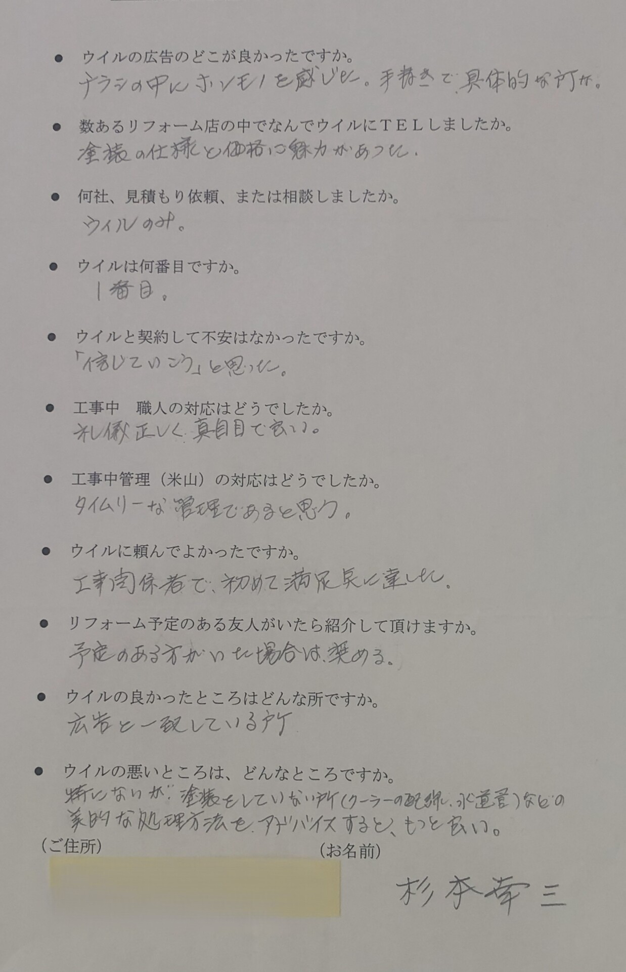ウイル(米山さん)の対応、工事仕様、価格、職人さん達の姿勢と施工、細部の気配りなど、工事関係で、初めての満足感を味わいました。