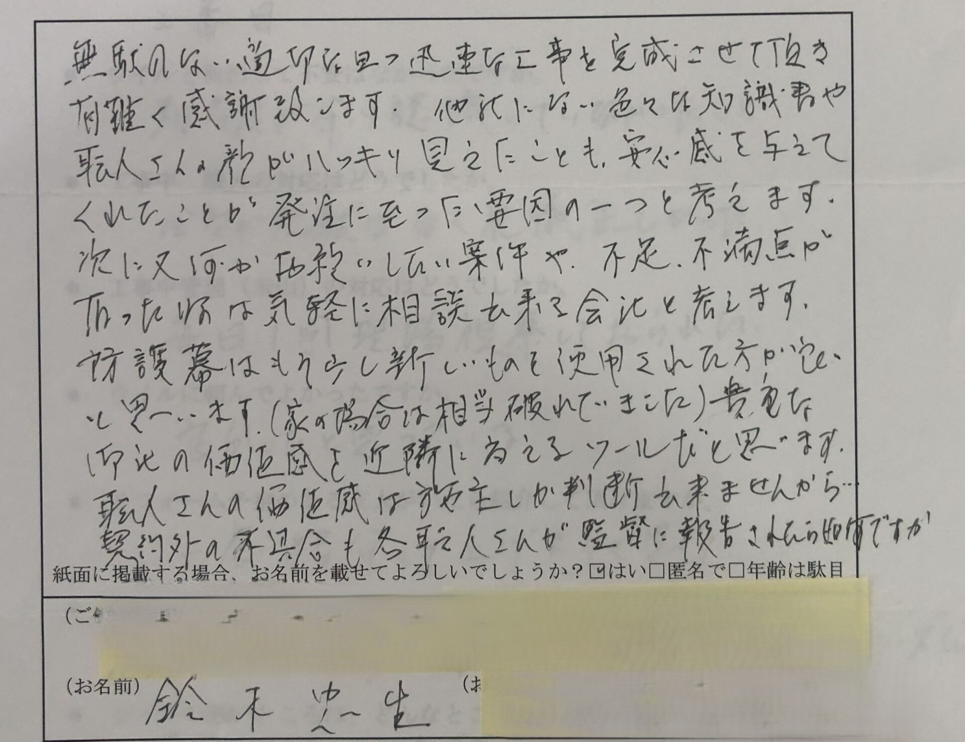 無駄のない適切な且つ迅速な工事を完成させて頂き有難く感謝致します。