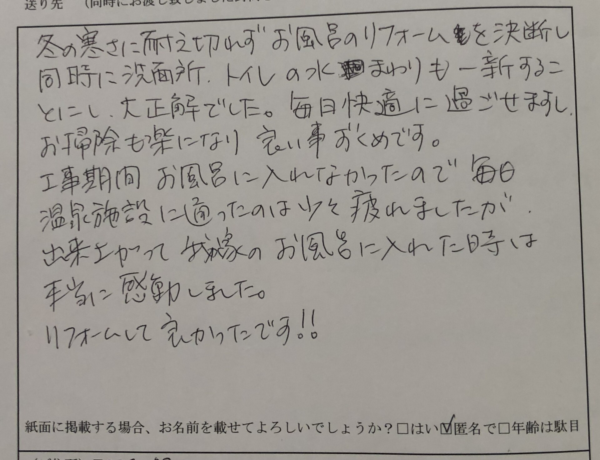 冬の寒さに耐えきれずお風呂のリフォームを決断し同時に洗面所、トイレの水回りも一新することにし、