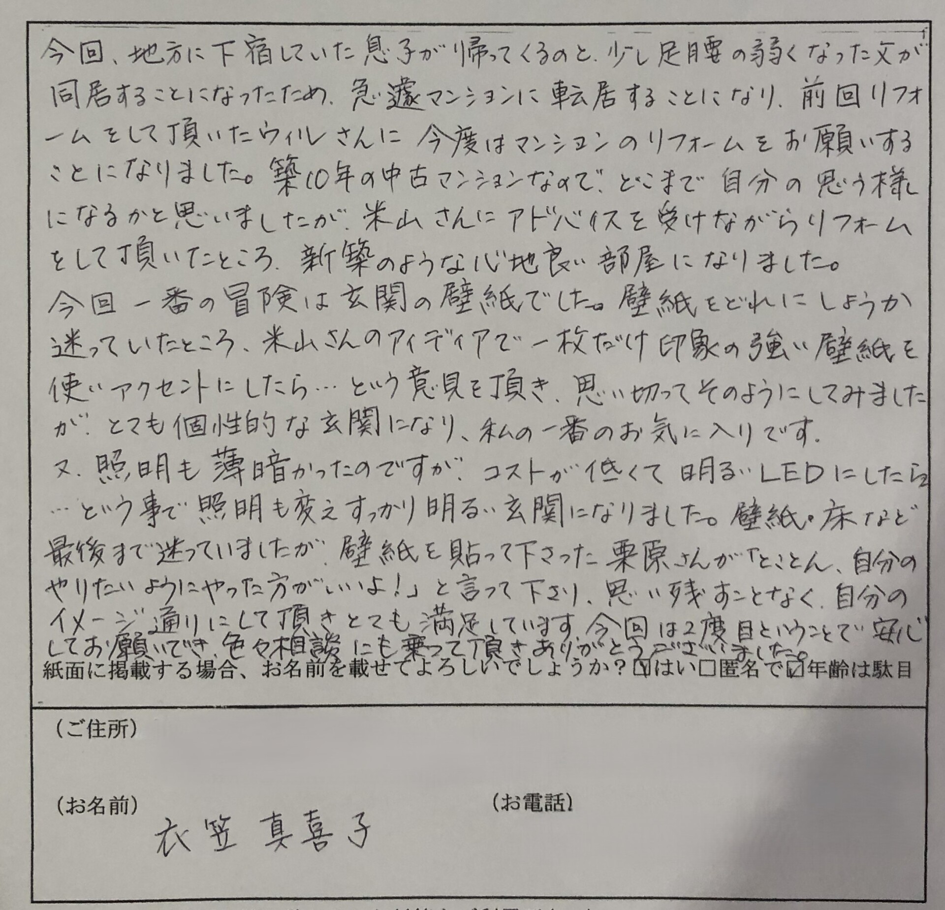 今回、地方に下宿していた息子が帰ってくると、少し足腰の弱くなった父が同居することなったため急遽マンションに転居することになり、前回リフォームをして頂いたウイルさんに今度はマンションのリフォームをお願いすることになりました。築10年の中古マンションのリフォームなどで、どこまで自分の思う様になるかと思いましたが、米山さんにアドバイスを受けながらリフォームをして頂いたところ新築のような心地良い部屋になりました。