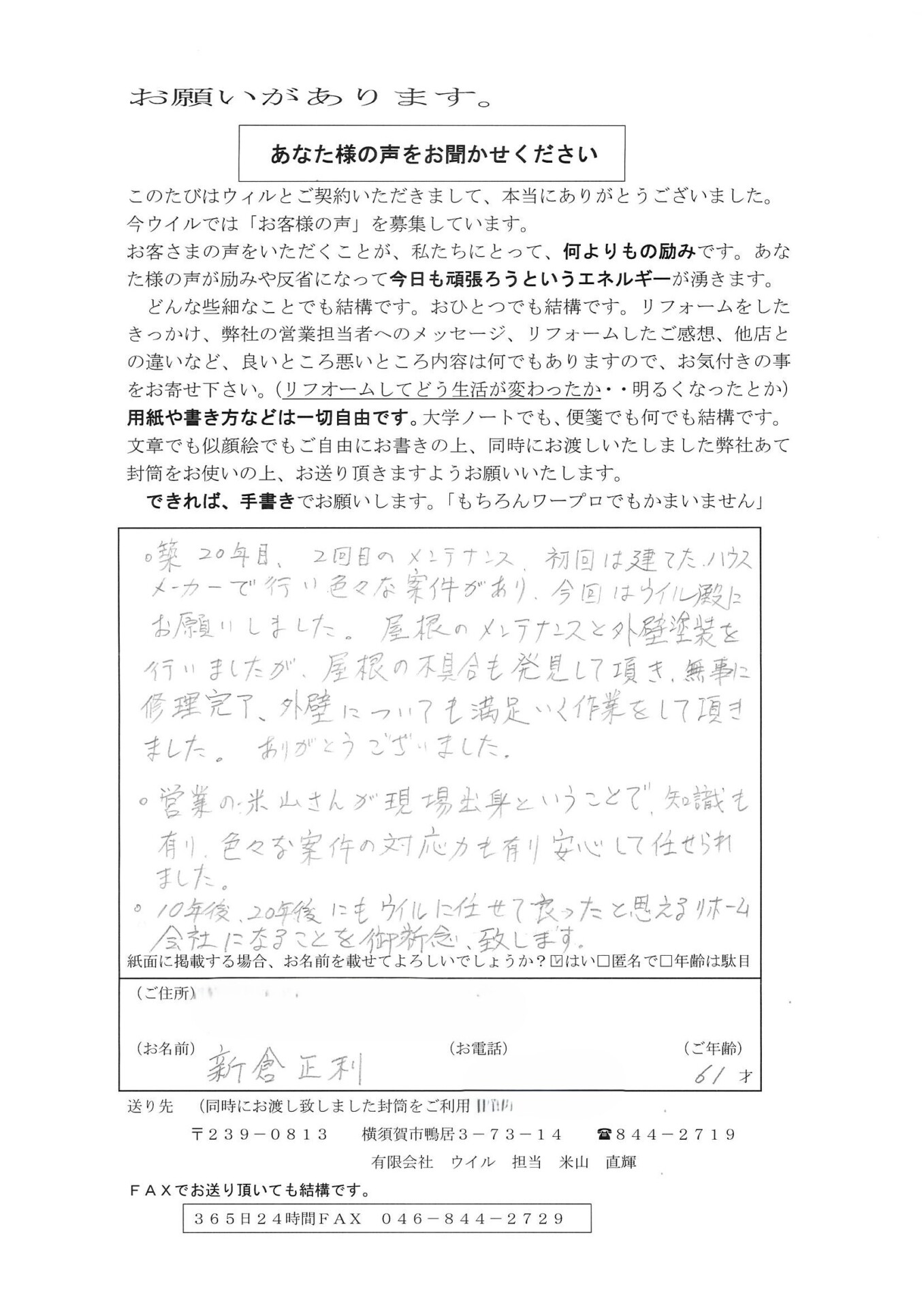 ・営業の米山さんが現場出身ということで、知識も有り色々な案件の対応力も有り安心して任せられました。