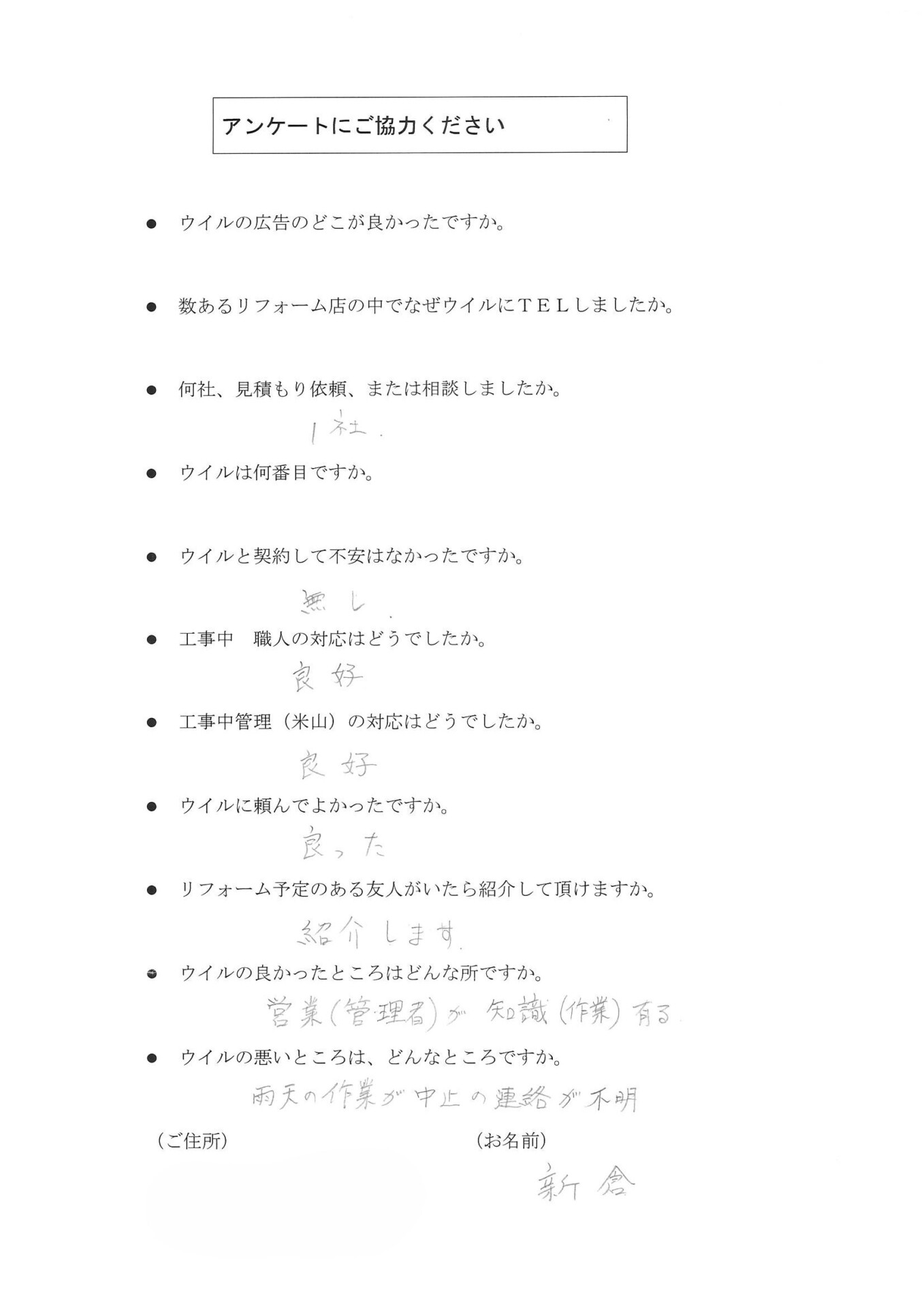 Q. 数あるリフォーム店の中でなぜウイルにしましたか。