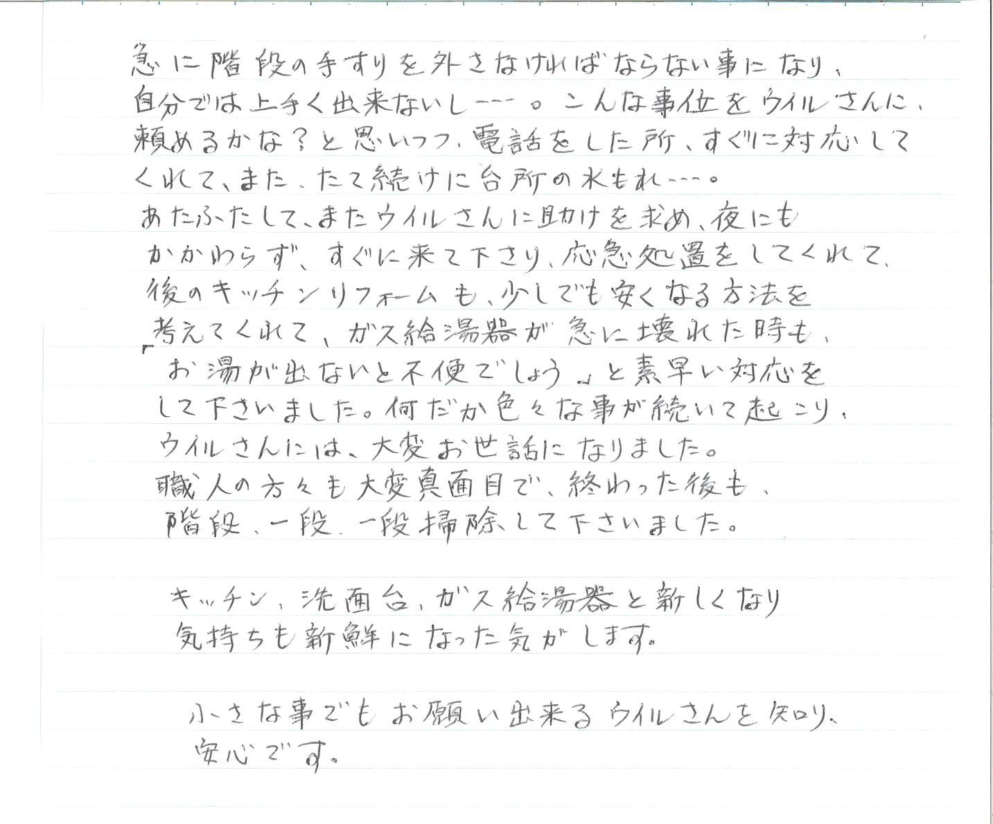 あたふたして、またウイルさんに助けを求め夜にもかかわらずすぐに来て下さり応急処置をしてくれて後のキッチンリフォームも少しでも安くなる方法を考えてくれて、ガス給湯器が急に壊れた時も「お湯が出ないと不便でしょう」と素早く対応をして下さいました。何だか色々な事が続いて起こり、ウイルさんには大変お世話になりました。