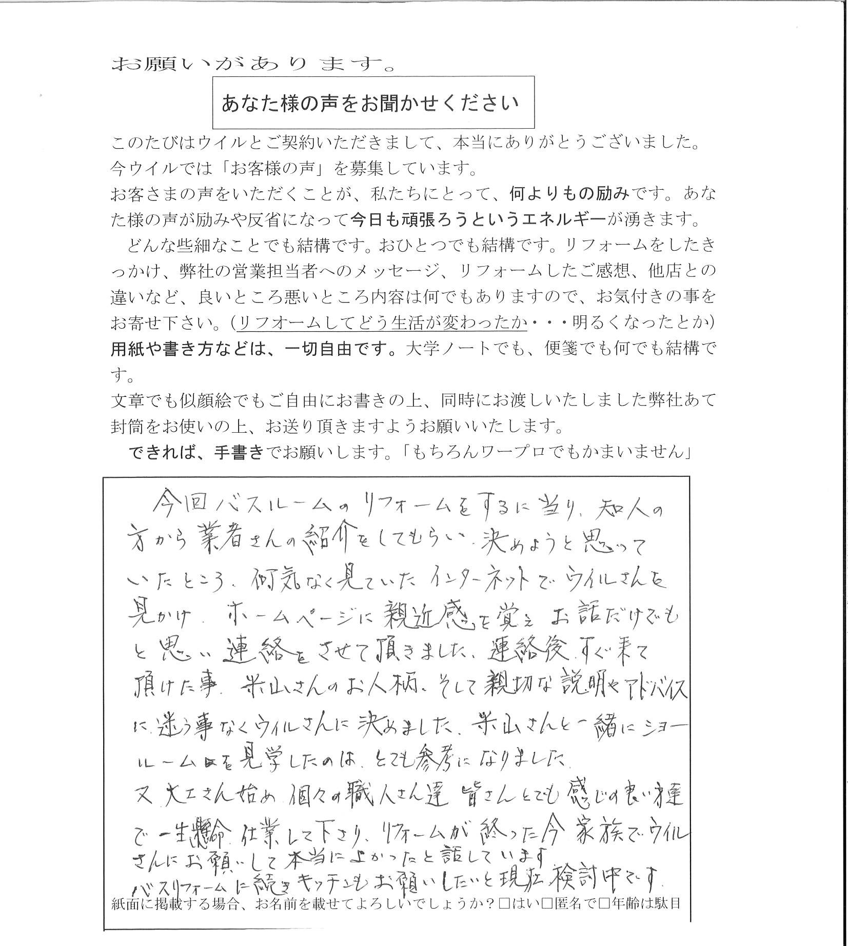 今回バスルームのリフォームをするに当り、知人の方から業者さんの紹介をしてもらい、決めようと思っていたところ、何気なく見ていたインターネットでウィルさんを見かけ、ホームページに親近感を覚え、お話だけでもと思い連絡をさせて頂きました。連絡後すぐ来て頂けた事、米山さんのお人柄、そして親切な説明やアドバイスに、迷う事なくウィルさんに決めました。米山さんと一緒にショールームを見学したのは、とても参考になりました。