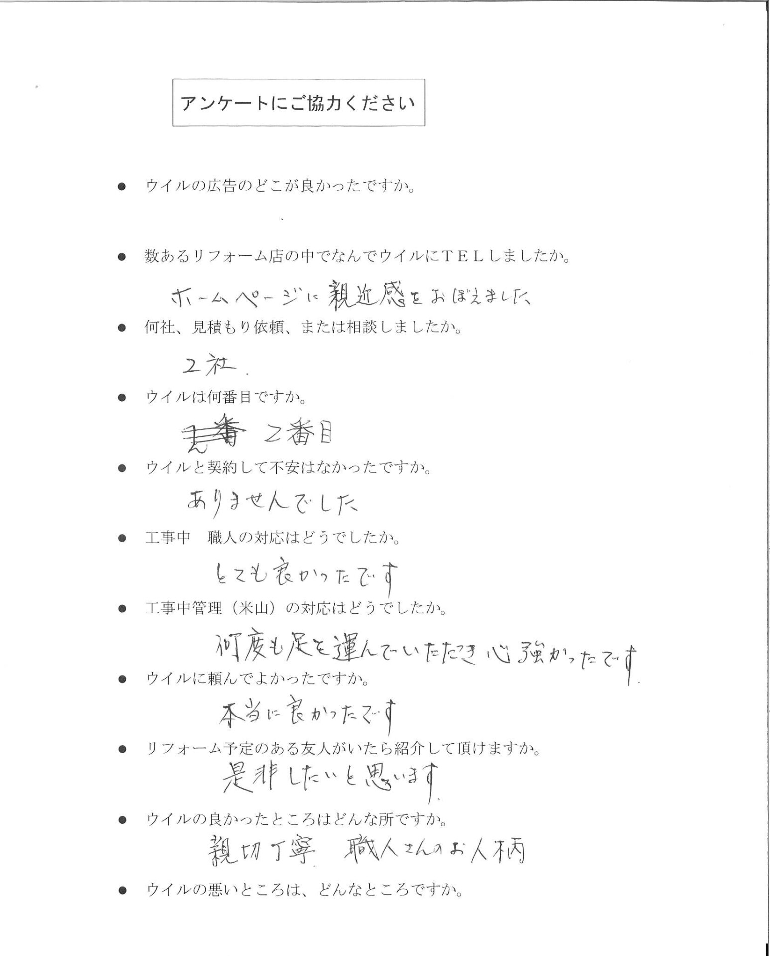 Q. 数あるリフォーム店の中でなぜウイルにTELしましたか。