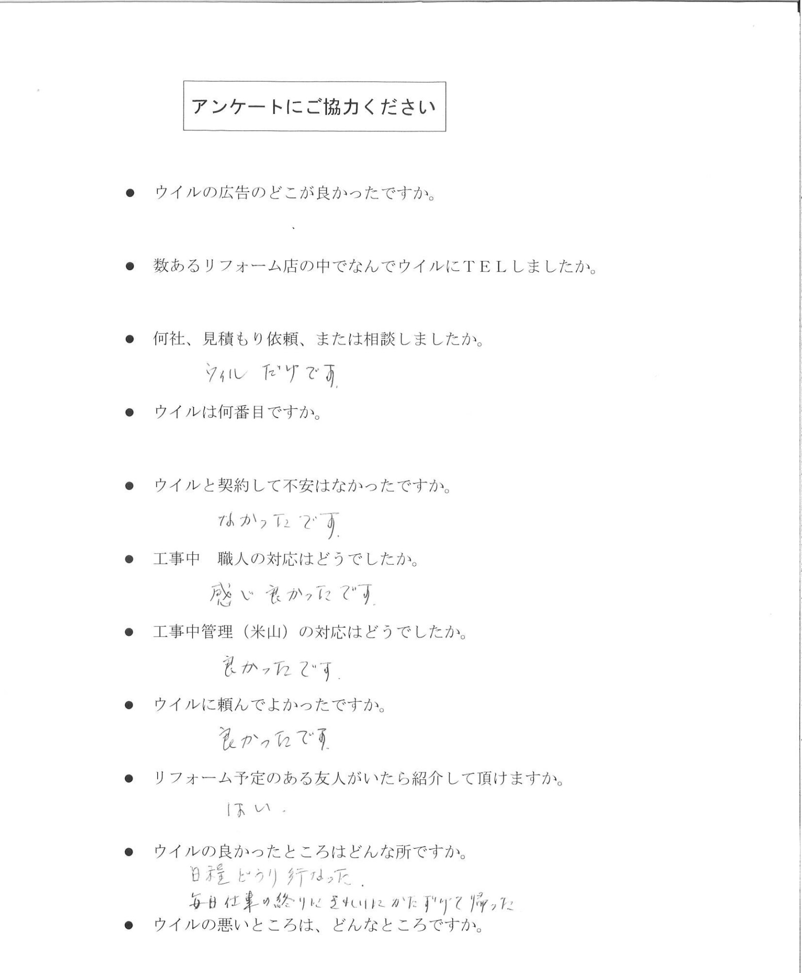 Q. 数あるリフォーム店の中でなぜウイルにしましたか。