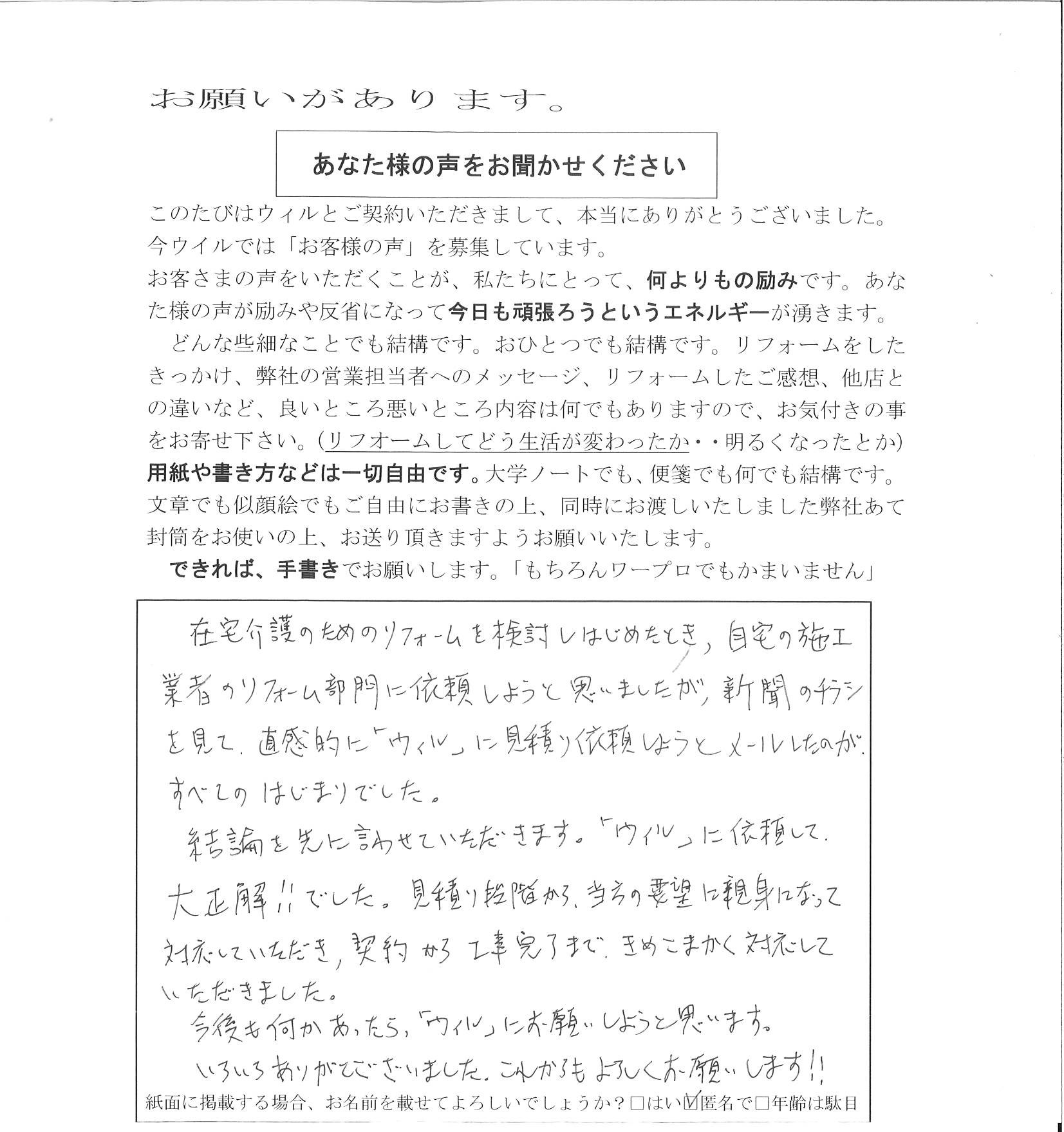 在宅介護のためのリフォームを検討しはじめたとき、自宅の施工業者のリフォーム部門に依頼しようと思いましたが、新聞のチラシを見て、直感的に「ウィル」に見積り依頼しようとメールしたのがすべてのはじまりでした。