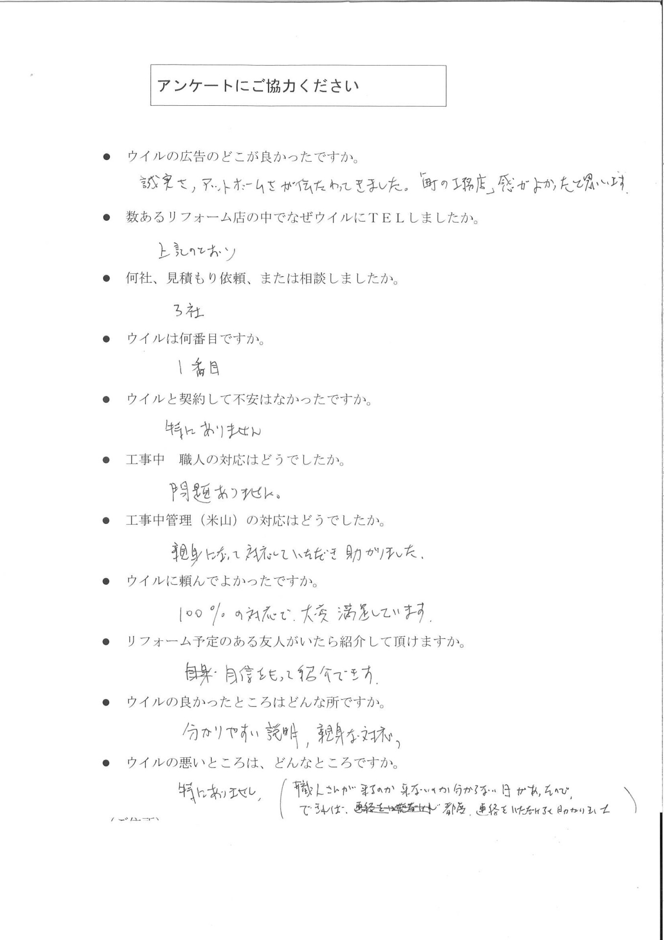 結論を先に言わせていただきます。「ウィル」に依頼して、大正解!!でした。見積り段階から、当方の要望に親身になって対応していただき、契約から工事完了まで、きめこまかく対応していただきました。